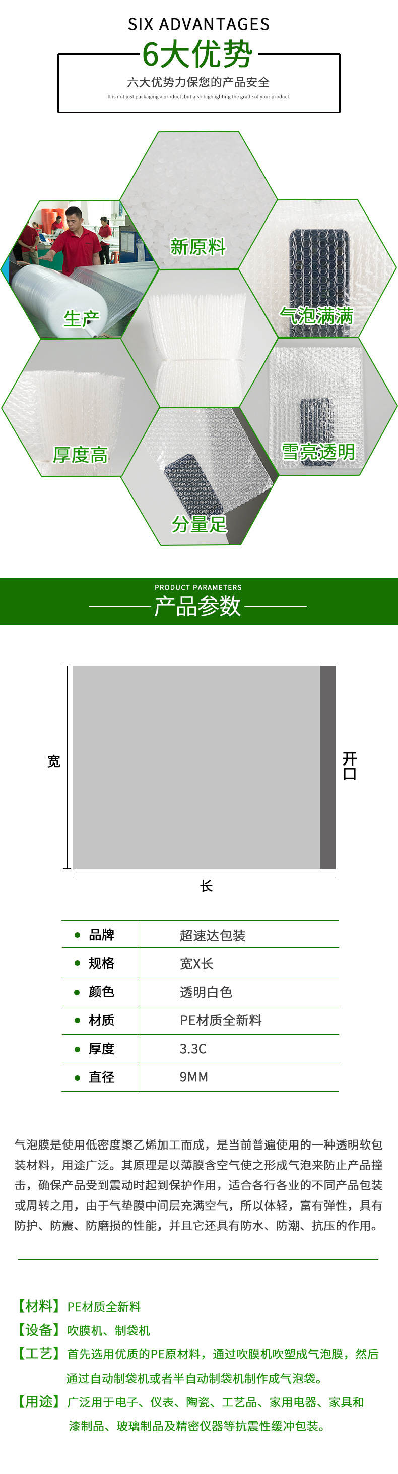 氣泡袋,又叫氣墊膜,氣珠膜,氣泡膜,氣泡紙,是采用LDPE低密度聚億烯樹脂加工而成。雙面氣泡袋防震力強適合體積較大較重之物品包裝。氣泡袋內附減震氣泡膜,氣泡膜中有無數(shù)小氣泡,所以體輕,富有彈性,具有隔音,防震防、防刮擦的功能,廣泛用于電子、儀表、陶瓷、工藝品、家用電器,自車行,廚房、家具、五金工具制品、玻璃制品及精密儀器等的抗震性緩沖、保護包裝??梢苑乐乖趥鬟f過程中對物品的擠壓、震動及摩擦等,對怕擠怕壓物品具有一定的保護作用。雙面氣泡袋可設防靜電氣泡袋,以及不同顏色、印刷.還可復合其它材料增加保護性及美觀。主要產(chǎn)品有單面氣泡袋、雙面氣泡袋、加厚氣泡袋、紅色氣泡袋、白色氣泡袋、防靜電氣泡袋。